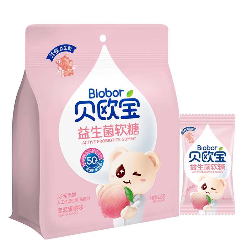商品名称:贝欧宝活性益生菌软糖 225g 水蜜桃味 休闲零食 儿童零食 糖果